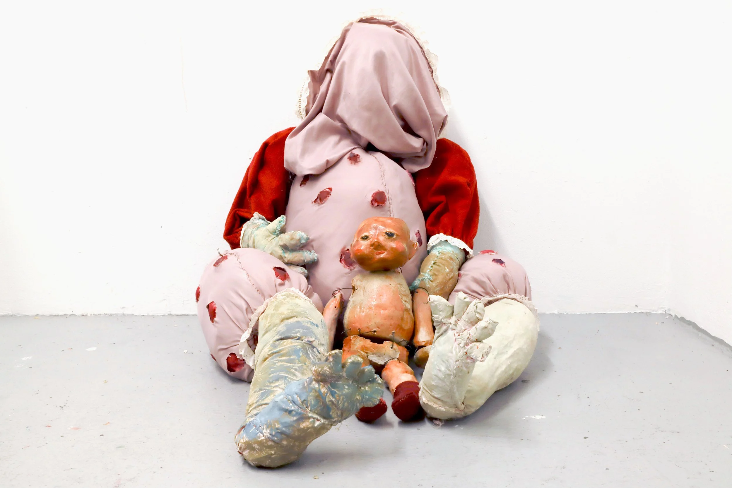 Cylinder-bellied, two bulged thighs. A loose gown falls, but goes up in disguise. Concealment should not happen, exposure is crucial. Suffocation's regrets are lost to this raw need for seeing. Polka dots, once on a child's dress, now blossom as wounds upon the skin. Ruffles adorn the thigh bloomers, a softness around the void between them. There is an emptiness that aches but a stark discovery, a burnt clay baby cradles within.