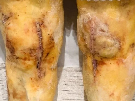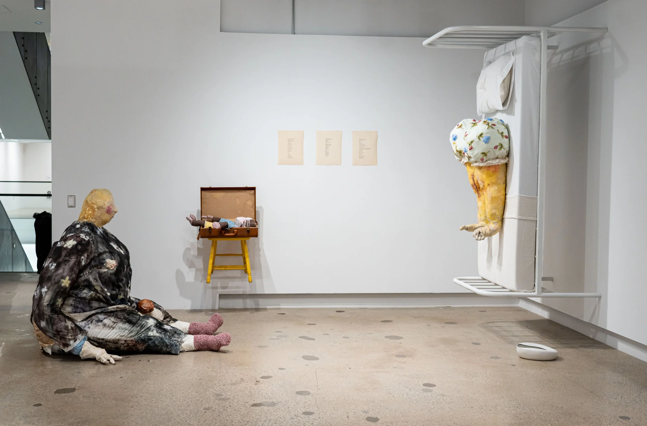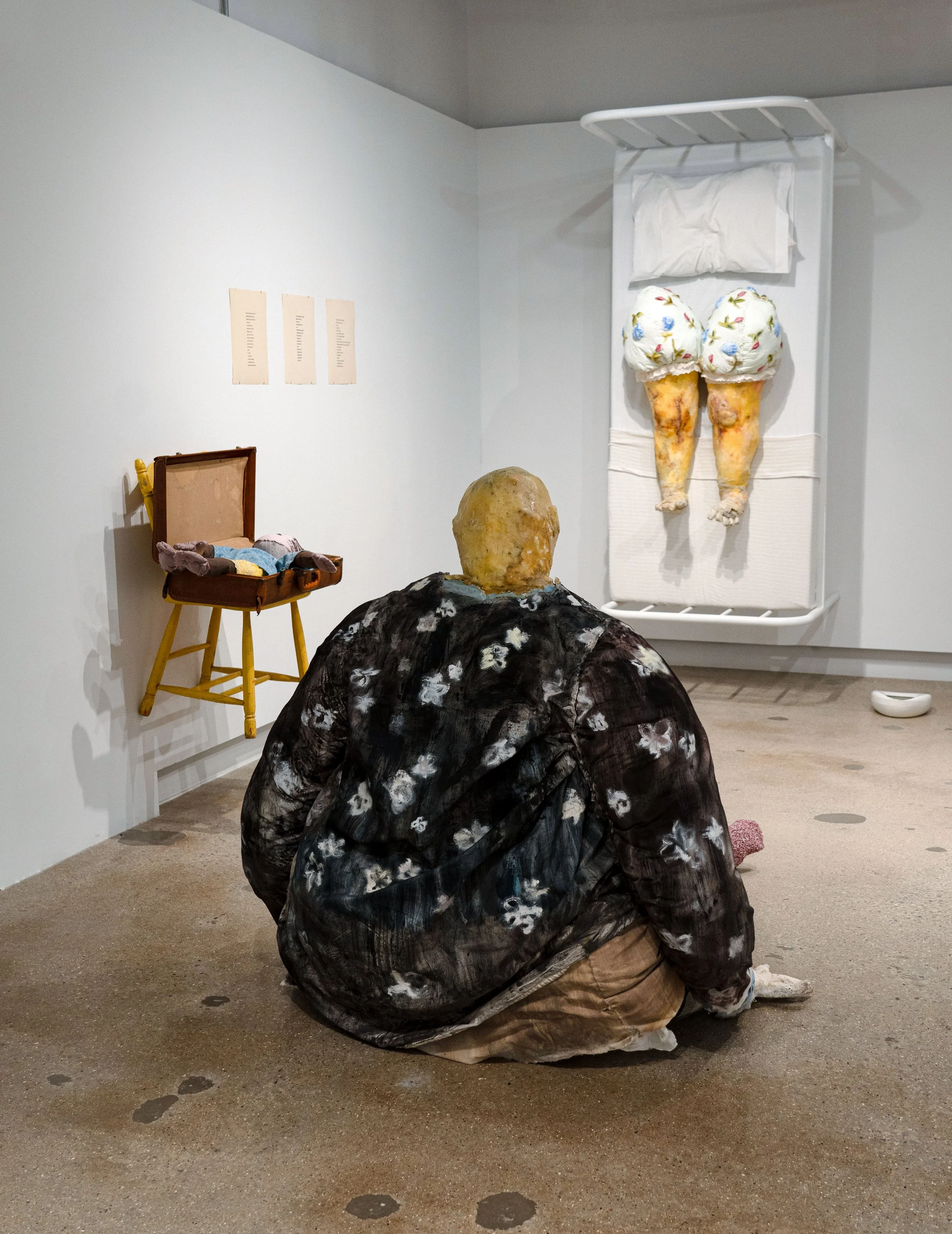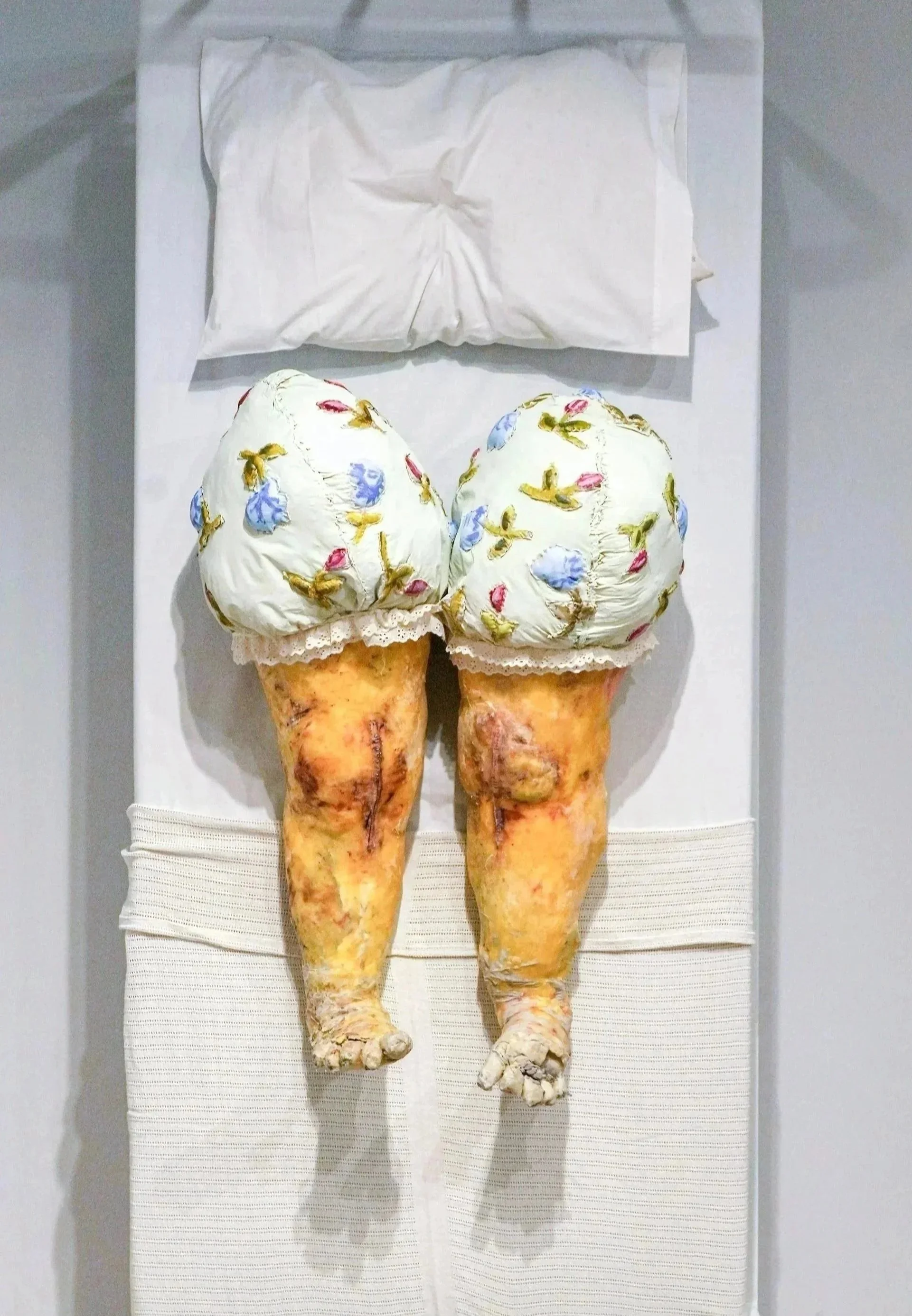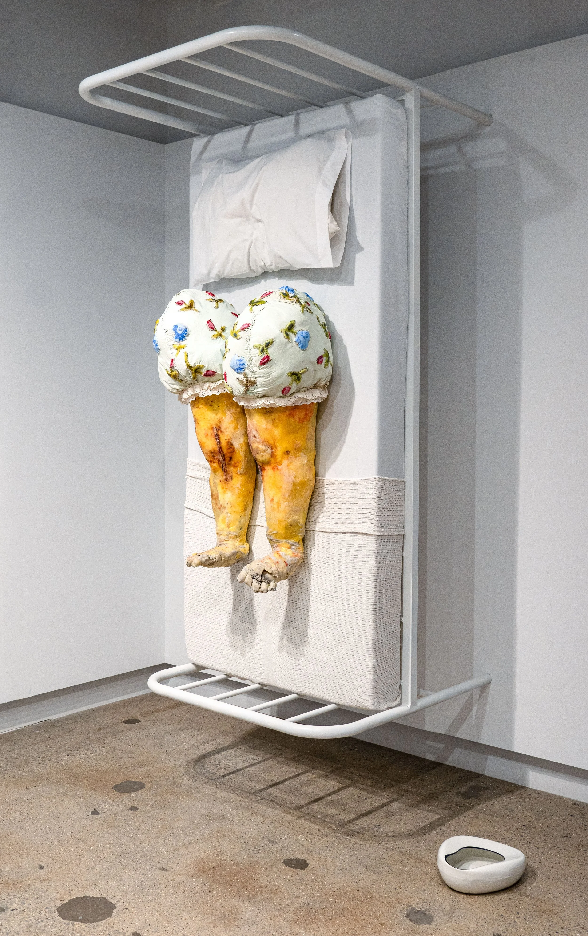 A full life-sized hospital bed—welded from steel—is suspended vertically on the wall. Mounted on it are a pair of knees, marked by the aftermath of joint replacement: long, stapled scars running down each leg. Created in 2024, 38 X 81 X 51 inches.