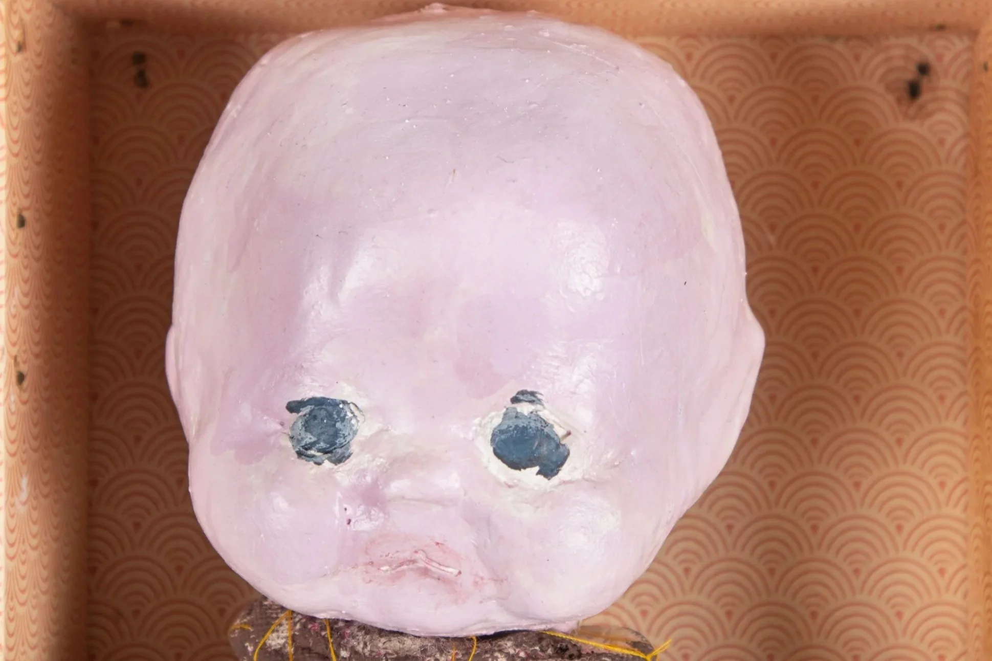 Containers hold the amitiés between objects and people—baby dresses, balmy patterns, textured skin, painted underclothing—here, the known order of the manufactured doll case meets the unknown of the handcrafted, the asymmetrical.