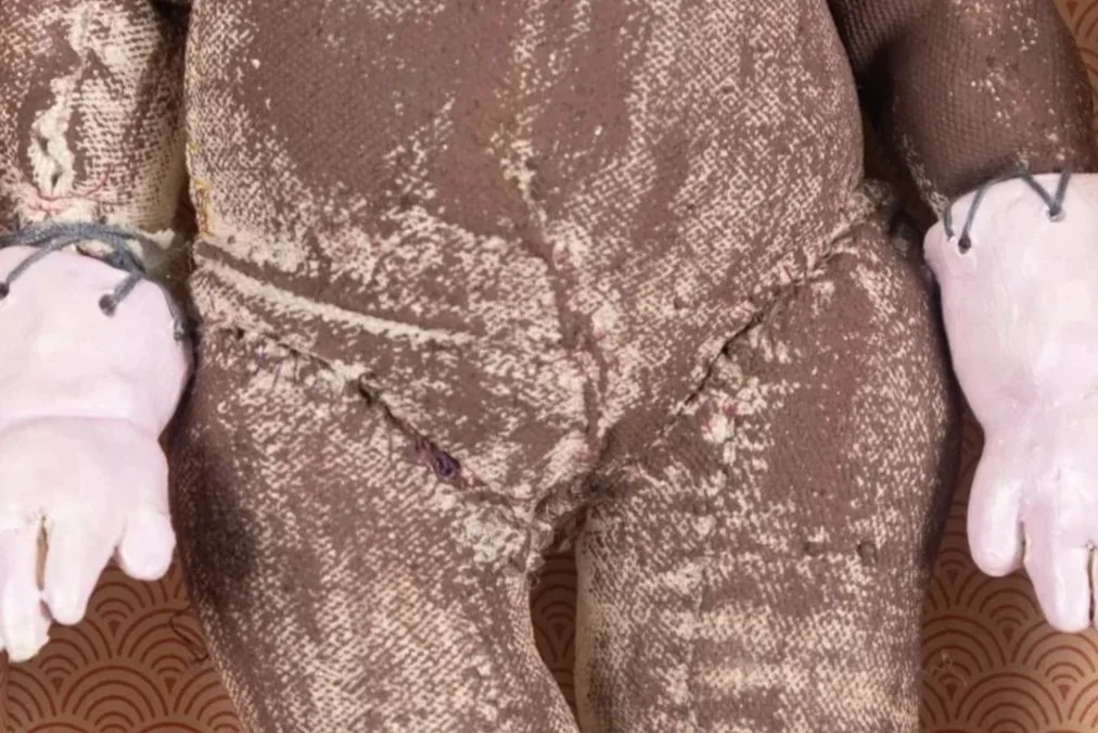 Found doll case and clothing, wire, air-dry clay, hide glue, paint, canvas. 18 x 18 x 6 inches